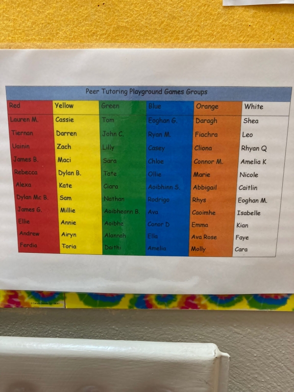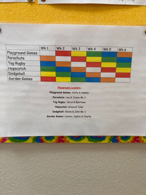 As the restrictions have eased again we decided to re-introduce the playground leaders onto the yard once again. The playground leaders are members of sixth class and they have been given a different game or activity to teach to the younger children over a 6 week period. The rest of the classes have been put into mixed groups in order to learn the new games or activities.